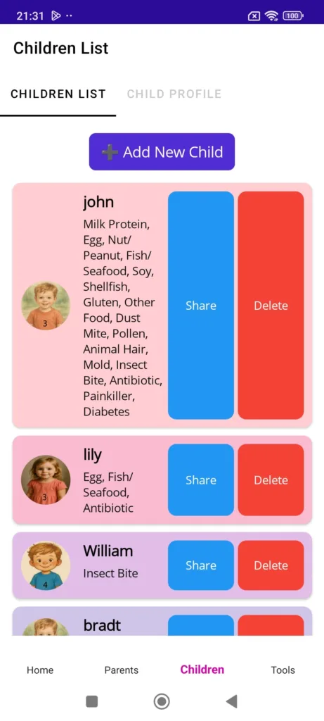 👶 Child Profiles – Save essential details like age, phone numbers, and health info.